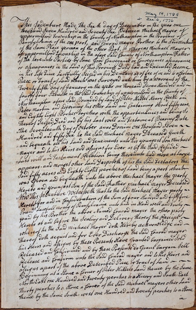 In the process of photographing artifacts for historical societies in eastern Pennsylvania, I was asked to record some documents for one society that were stored in an acid-free box, which had been stuck in the back of a closet. In the box, in a manila envelope, were many documents that included land sale contracts, wills, a divorce decree, and a labor contract between an apprentice and a farmer.